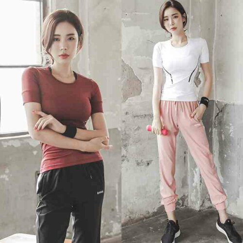 トレーニングウェア ヨガウェア レディース 2点セット ジム セットアップ ジャージ 上下セット フィットネス 大きいサイズ おうち時間 ルームウェア 半袖 Tシャツ 運動会 部屋着 トップス ボトムス パジャマ クルーネック 2色
