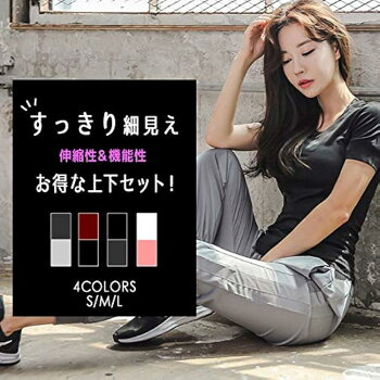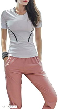 ヨガウェア レディース 上下セット ジム スポーツウェア 半袖 Tシャツ 2点セット 伸縮性 吸汗速乾(ホワイト/ピンク, S)